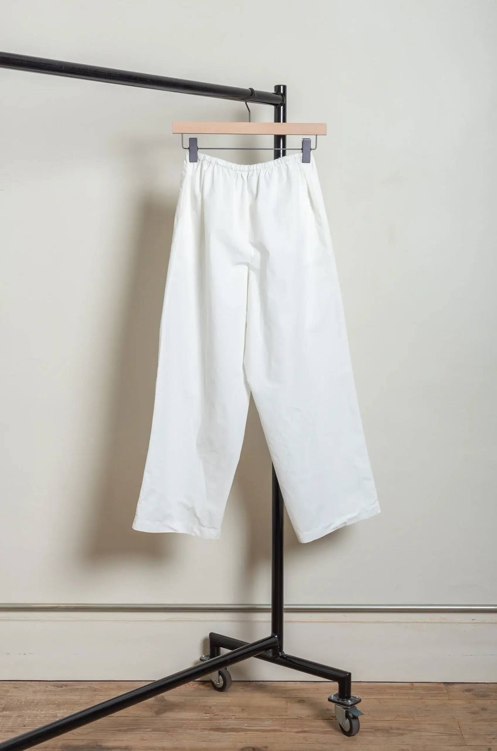 piece that is both versatile and comfortable. Their slightly relaxed, straight-leg silhouette allows fluid movement while maintaining a clean, modern line. Moreover, the undyed organic cotton fabric emphasizes subtle texture and softness, offering comfort without sacrificing structure.
