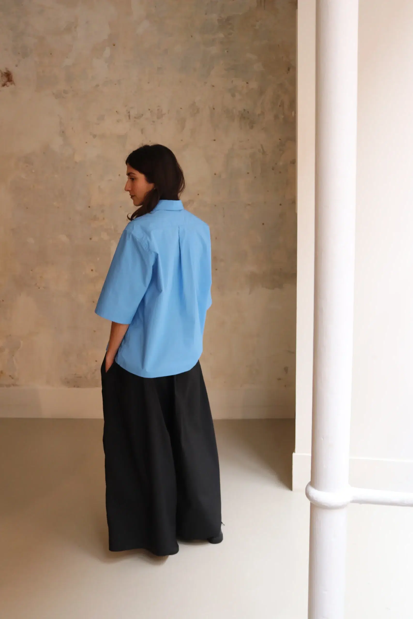 The wide-leg construction amplifies freedom of movement while maintaining a clean and intentional line throughout the day. In addition, the thoughtful cut reinforces proportion and elongation, while preserving softness and ease in every step. You can rely on this design for structured monochrome looks, layered contemporary silhouettes, or elevated everyday styling where volume, clarity, and understated sophistication remain essential.