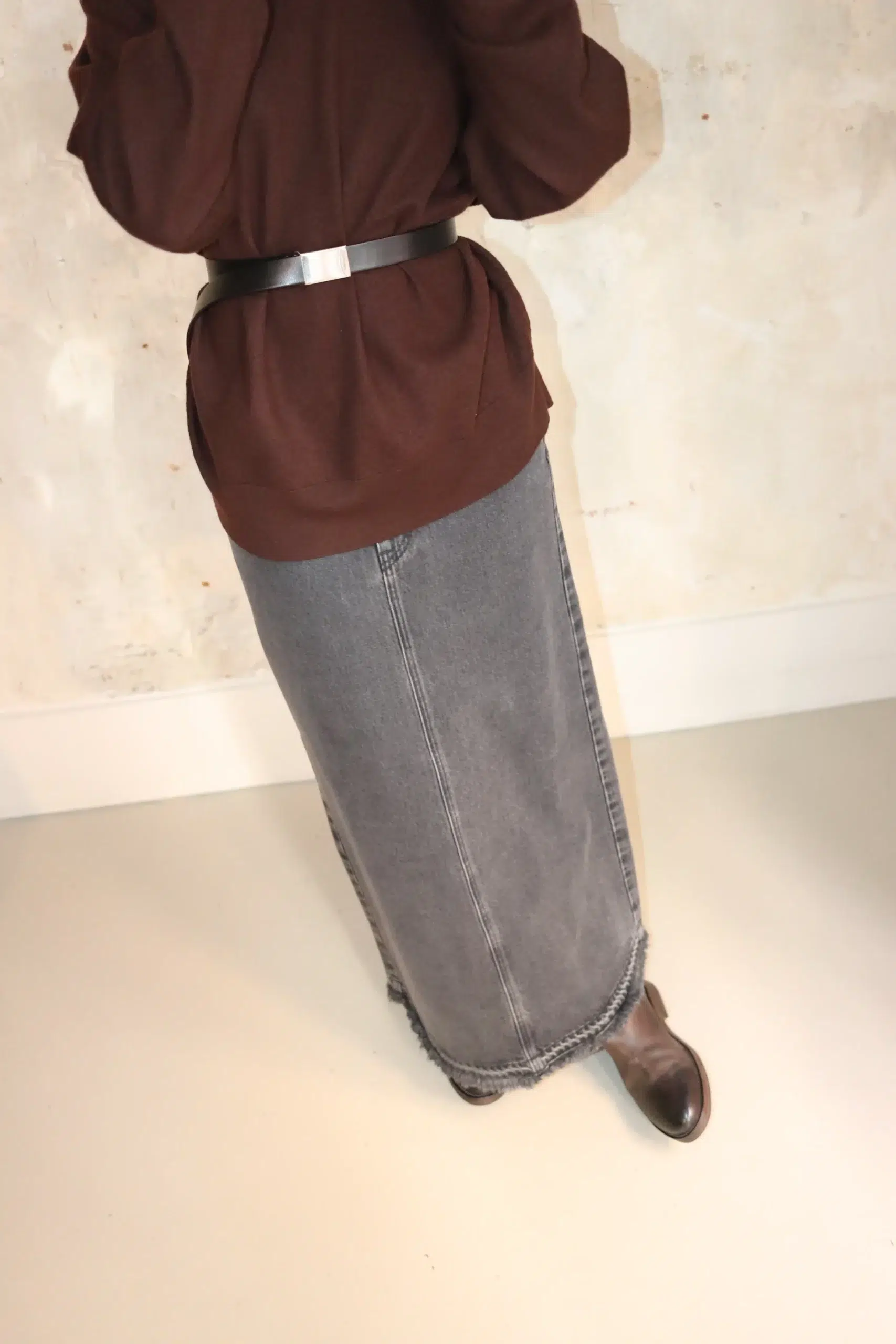 In addition, the skirt’s clean, minimal silhouette allows effortless layering and styling. As a result, it works well for both casual and slightly elevated looks. Furthermore, the carefully crafted seams and precise finishing enhance its refined, understated character. Consequently, this denim skirt balances practicality with quiet elegance.