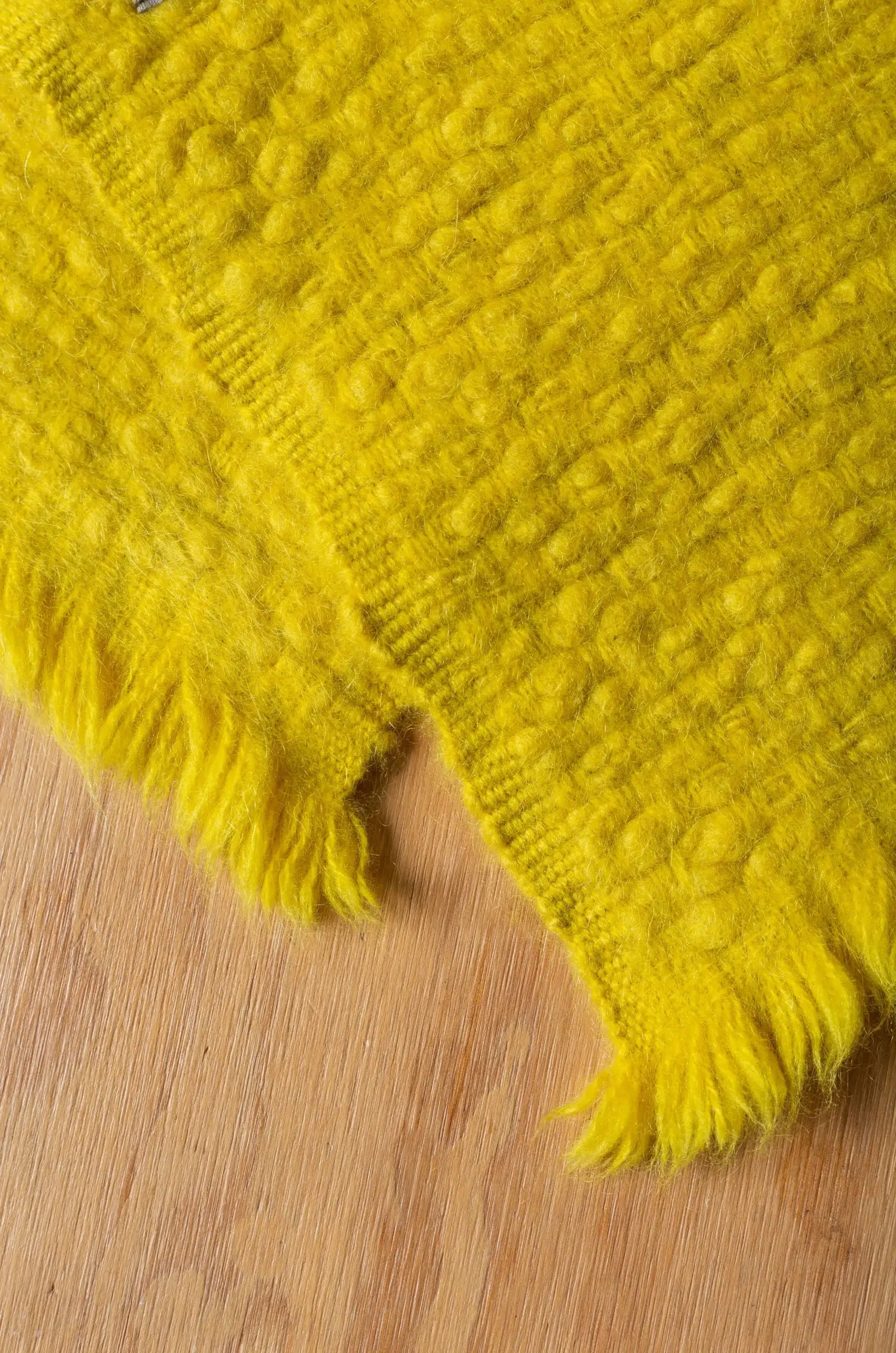 This neck warmer is made from pure yak khullu in a thick, warm weave. The finished fabric is boiled for added density and a fleece-like touch. It can be worn knotted snugly around the neck or pinned for a looser fit. The pin is included with the piece.