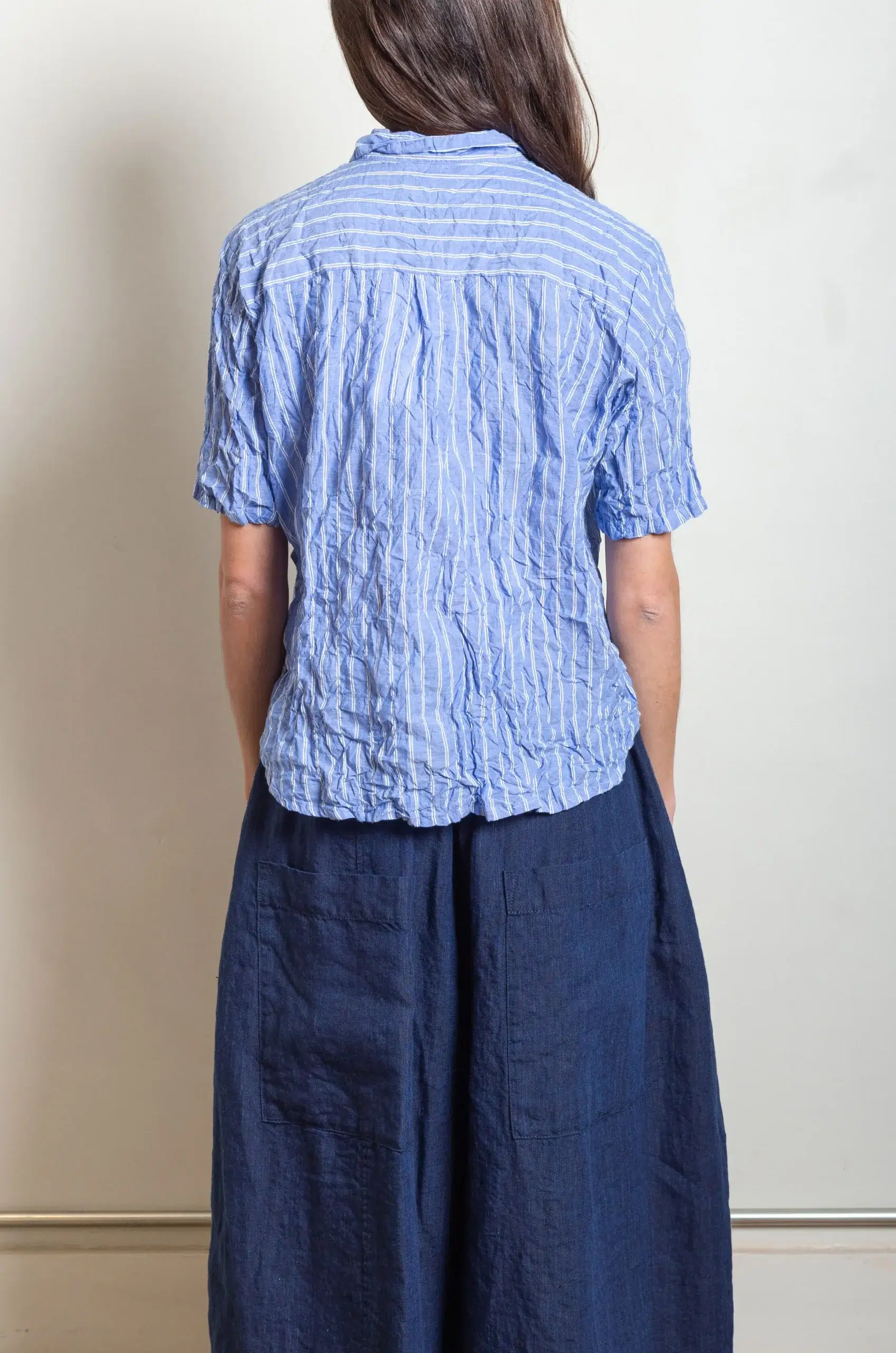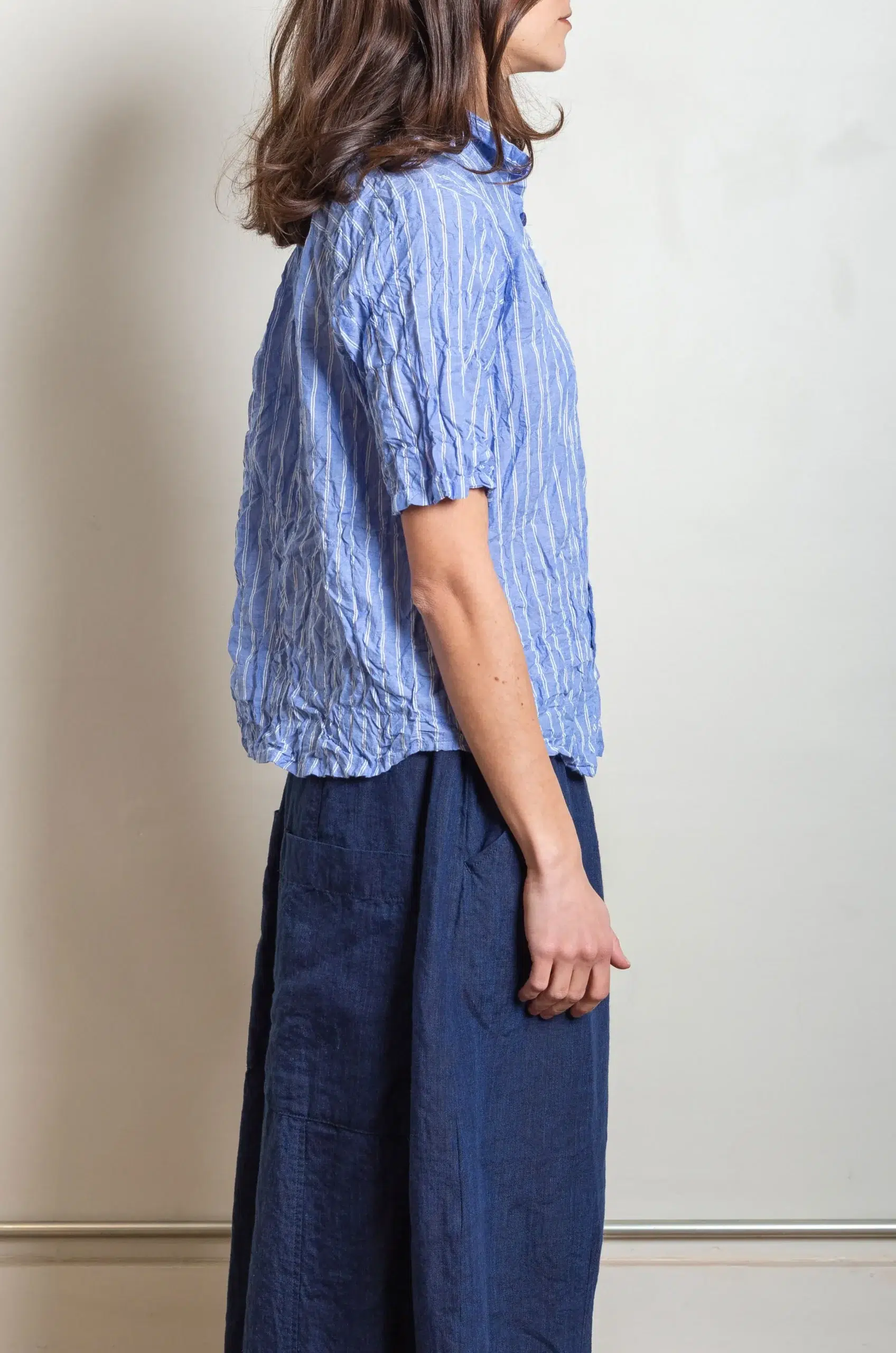 The blouse silhouette feels relaxed yet thoughtfully constructed, allowing a natural drape that moves effortlessly with the body. In addition, the lightweight design makes it ideal for layering or wearing alone, adapting easily to different seasons and styling moods.